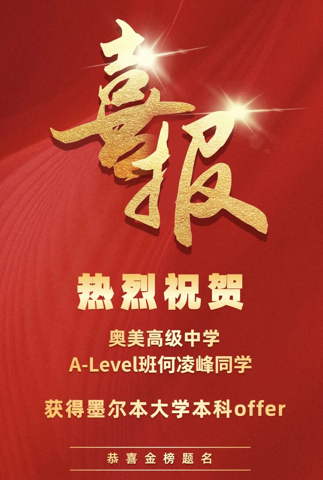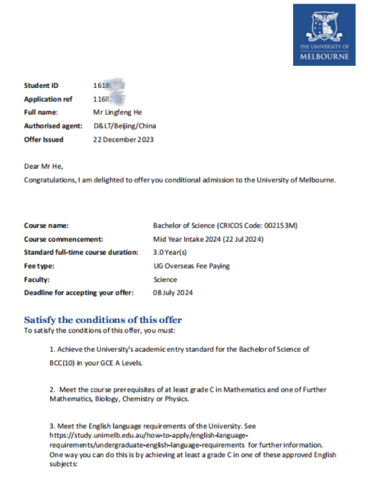 12月22号,2021级A-Level班何同学收到了他的首份offer。他凭借个人出色的学业成绩以及语言成绩斩获了澳洲名校墨尔本大学(QS世界排名第14名)的录取通知书,也是我校第五名获取该大学录取的学生,这不仅是对我校学子学业成绩的认可,也是对我校教学质量的认可!